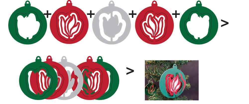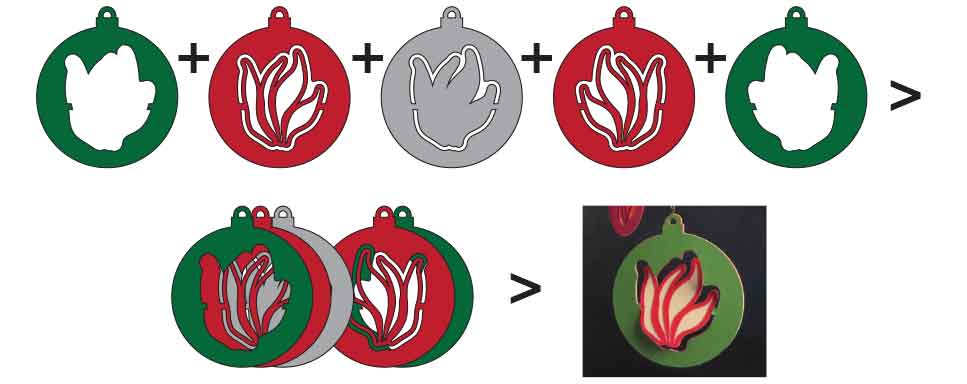 Julepynten laves lidt ligesom dem med vippe/dreje-logo. Også her anvendes tre farver. Det betyder at der er to udskæringer på hver side af det midterste lag. Og samtidig er der tilføjet en kontur som er udskåret i alle lag. Vingerne er blot et enkelt snit – her er ikke noget der skal skæres væk.