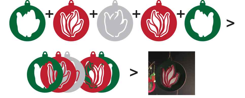 Hvis du er kommet igennem første udgave og er klar til en ny udfording, kan du her give dig i kast med en julekugle som er betydelig sværere. I stedet for to farver er der nu tre. Det betyder at der er to udskæringer på hver side af det midterste lag. Og samtidig har vi tilføjet en kontur som er udskåret i alle lag.