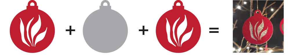 Julepynten med dreje-logo laves ligesom dem med vippe-logo. Også her anvendes tre farver. Det betyder at der er to udskæringer på hver side af det midterste lag. Og samtidig har vi tilføjet en kontur som er udskåret i alle lag.