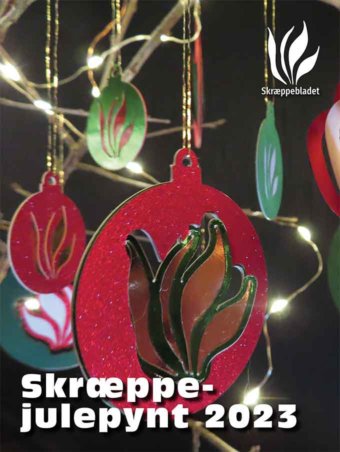 Hent pdf fra Skræppebladets hjemmeside, hvor du gratis kan hente skabeloner til at lave din egen julepynt. Du kan hente som pdf – lige til at printe ud og tegne/skære af efter. Eller hent som svg-fil, der kan skaleres præcis, som du har lyst. Svg-filerne kan også bruges, hvis du har en maskine, der kan skære for dig.