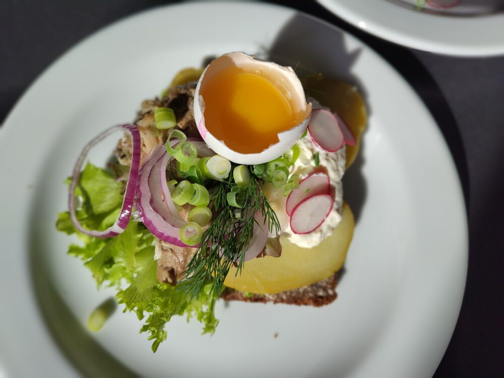 Et stykke smørsmurt rugbrød med kogt kartoffel, rygeostcreme og stykker af røget makrel med løg og radiser og pyntet med dild. Hertil et styk valgfri æggeblomme. Og voila – en klassiker er født.