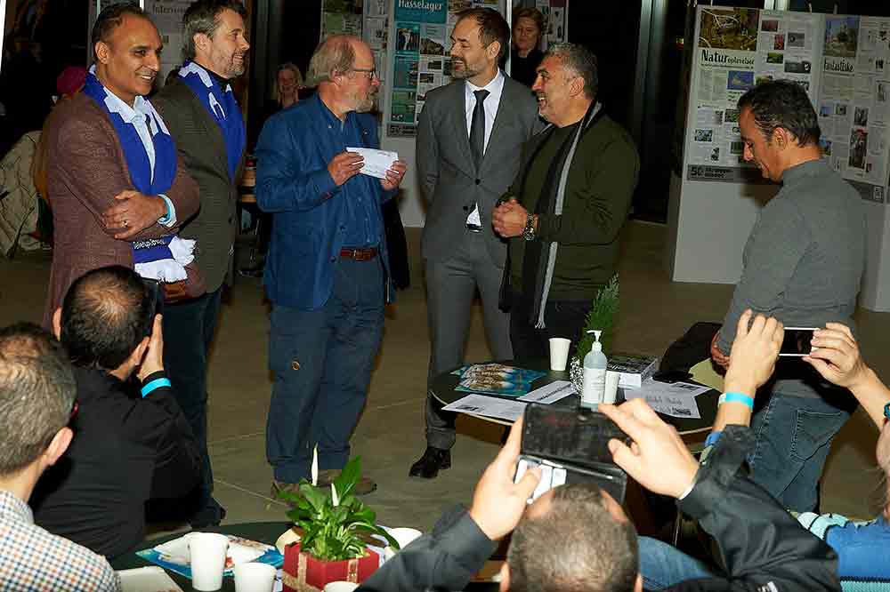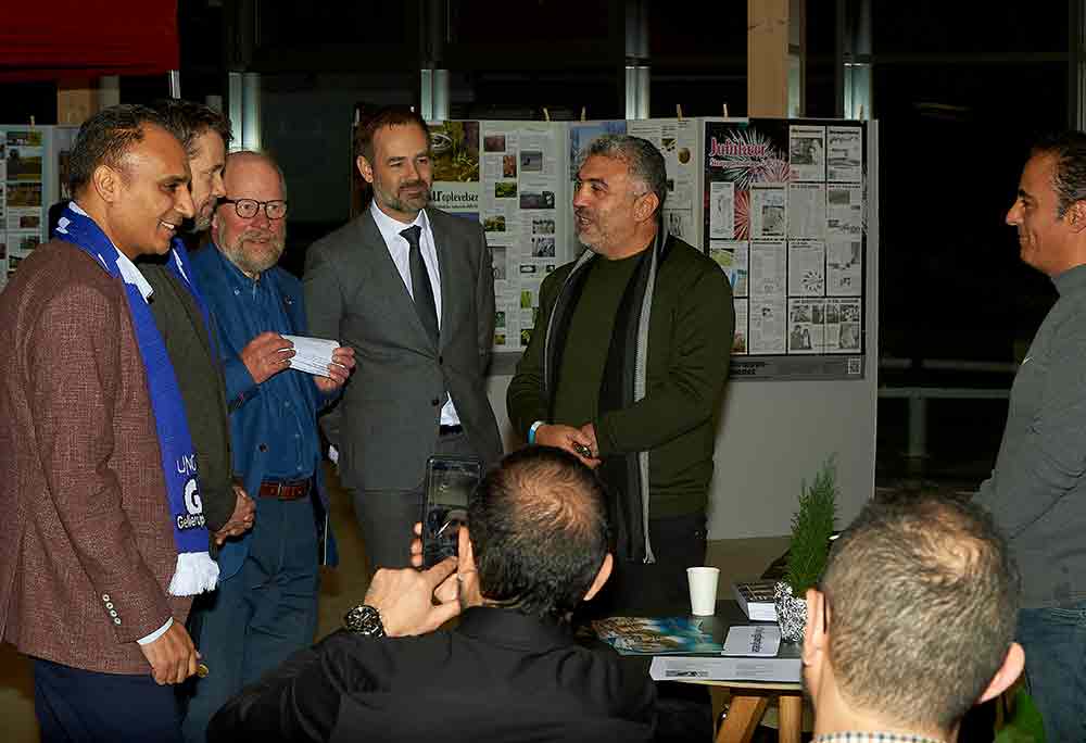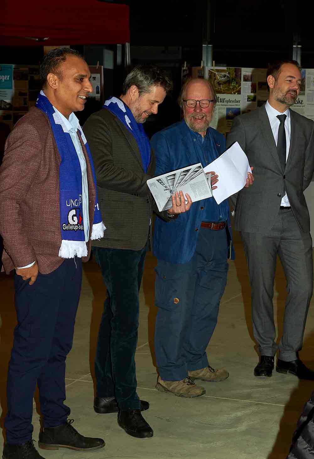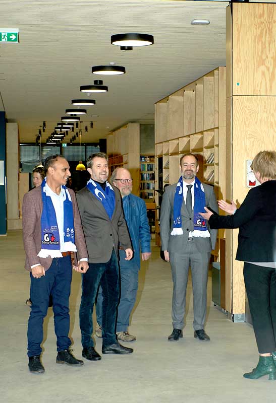 H.K.H. Kronprins Frederik, rådmand for Kultur og Borgerservice Rabih Azad-Ahmad, formand for Brabrand Boligforening Keld Albrechtsen og borgmester i Aarhus Jacob Bundsgaard i Samlingssalen. I baggrunden ses Skræppebladets jubilæumsudstilling og kommunikations- og marketingschef Tania Andersen (t.h.)