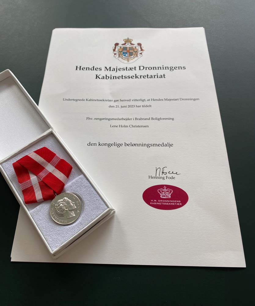 Efter næsten 44 års dedikation i boligforeningen blev Lene tildelt Den Kongelige Belønningsmedalje som en påskønnelse for hendes langvarige og betydningsfulde indsats.